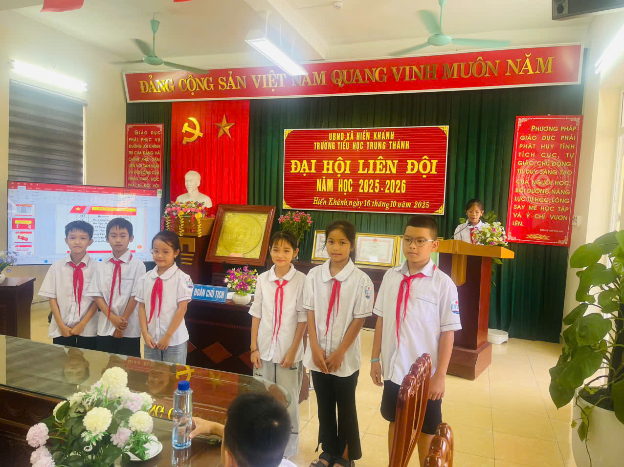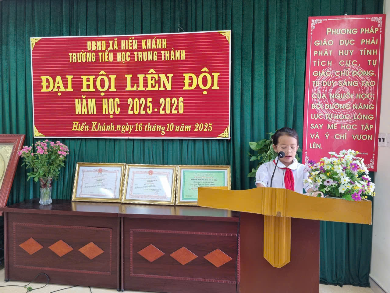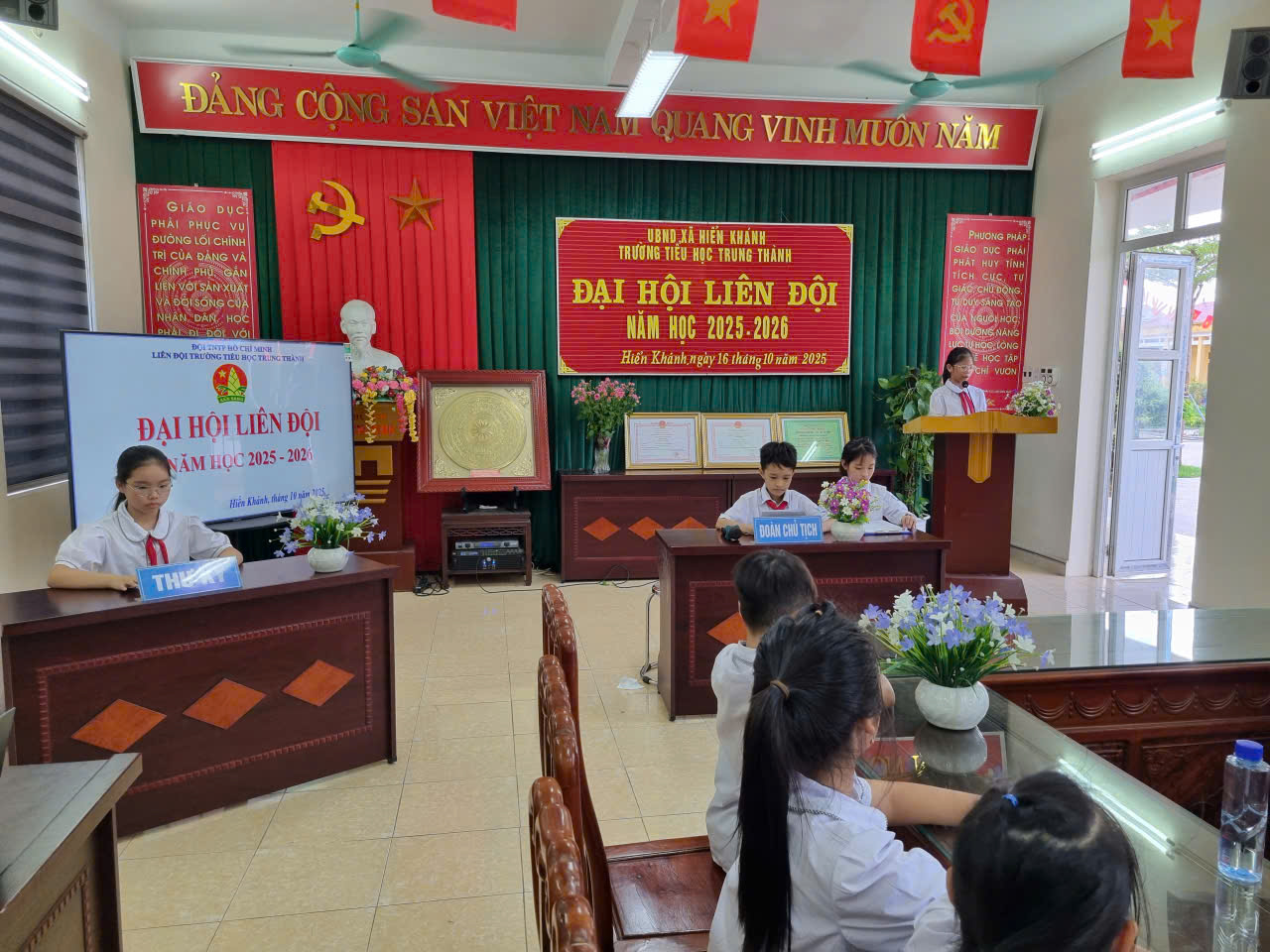 Thực hiện chương trình công tác Đội và phong trào thiếu nhi năm học 2025 – 2026, thực hiện sự chỉ đạo của Hội đồng Đội xã Hiển Khánh và được sự nhất trí của Chi bộ, Ban lãnh đạo nhà trường, chiều ngày 17 tháng 10 năm 2025, Liên đội trường Tiểu học Trung Thành đã long trọng tổ chức Đại hội Liên đội nhằm đánh giá những kết quả đã đạt được trong nhiệm kỳ năm học 2024 – 2025 và đề ra phương hướng nhiệm vụ nhiệm kỳ năm học 2025 – 2026.