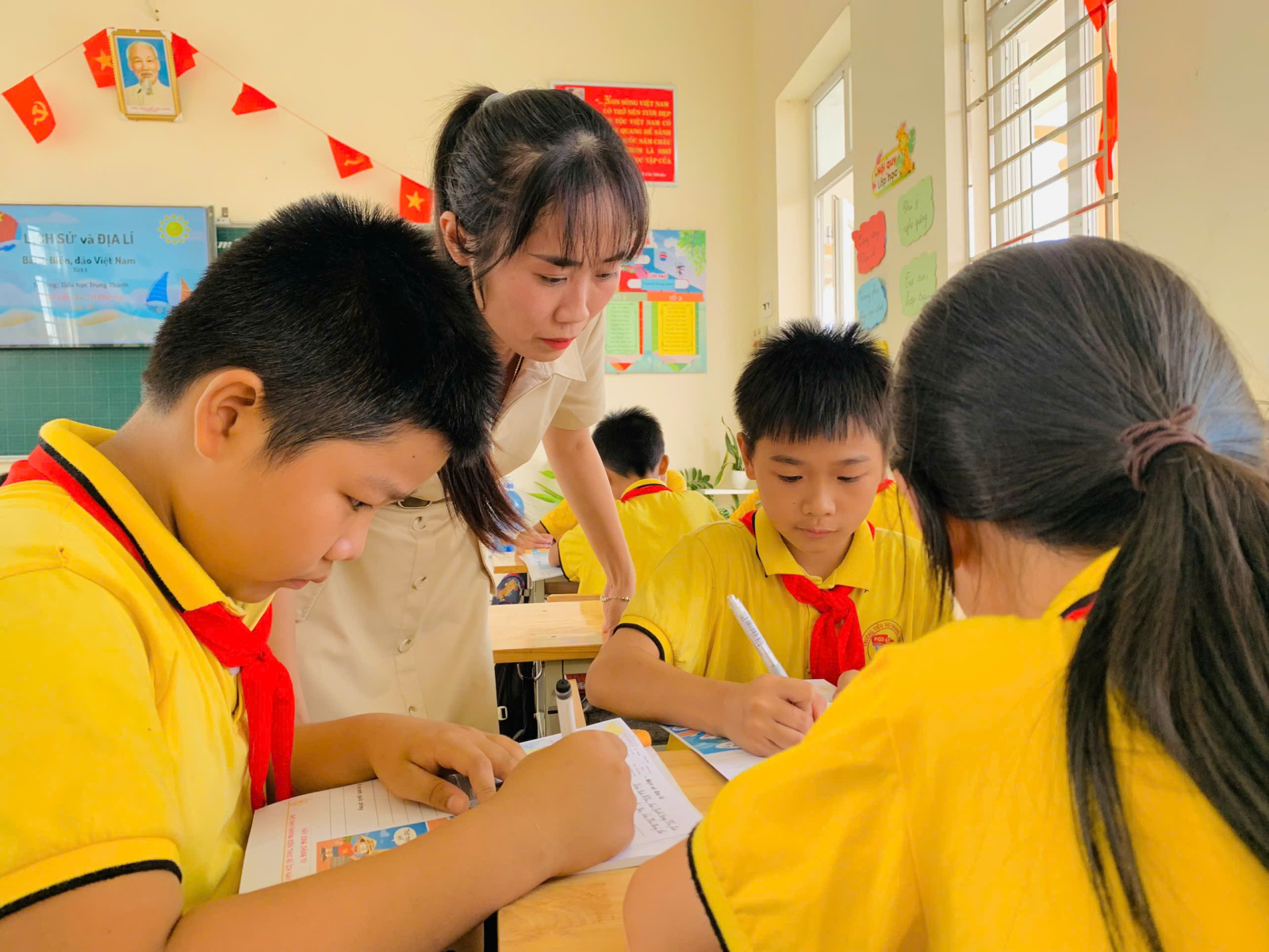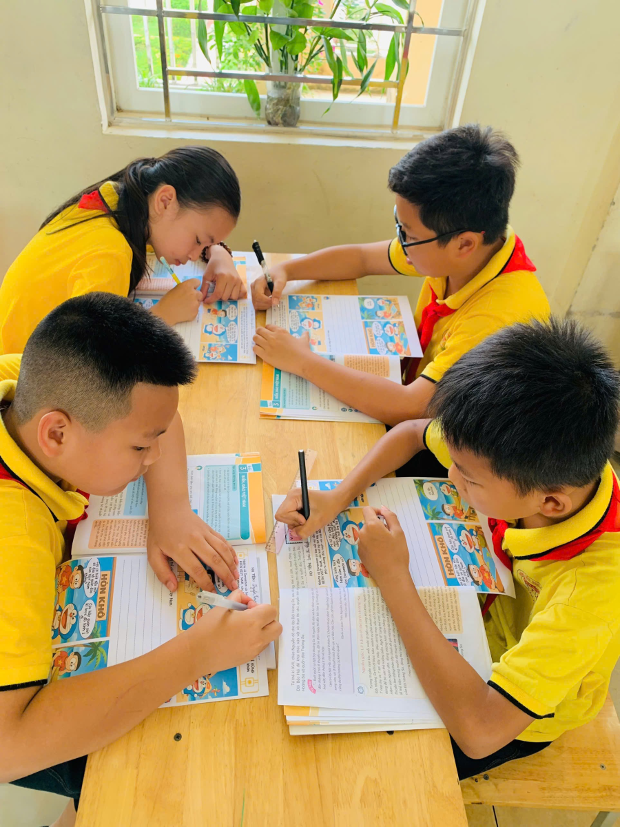 Hình ảnh các em học sinh thảo luận nhóm và chia sẻ kết quả thảo luận nhóm