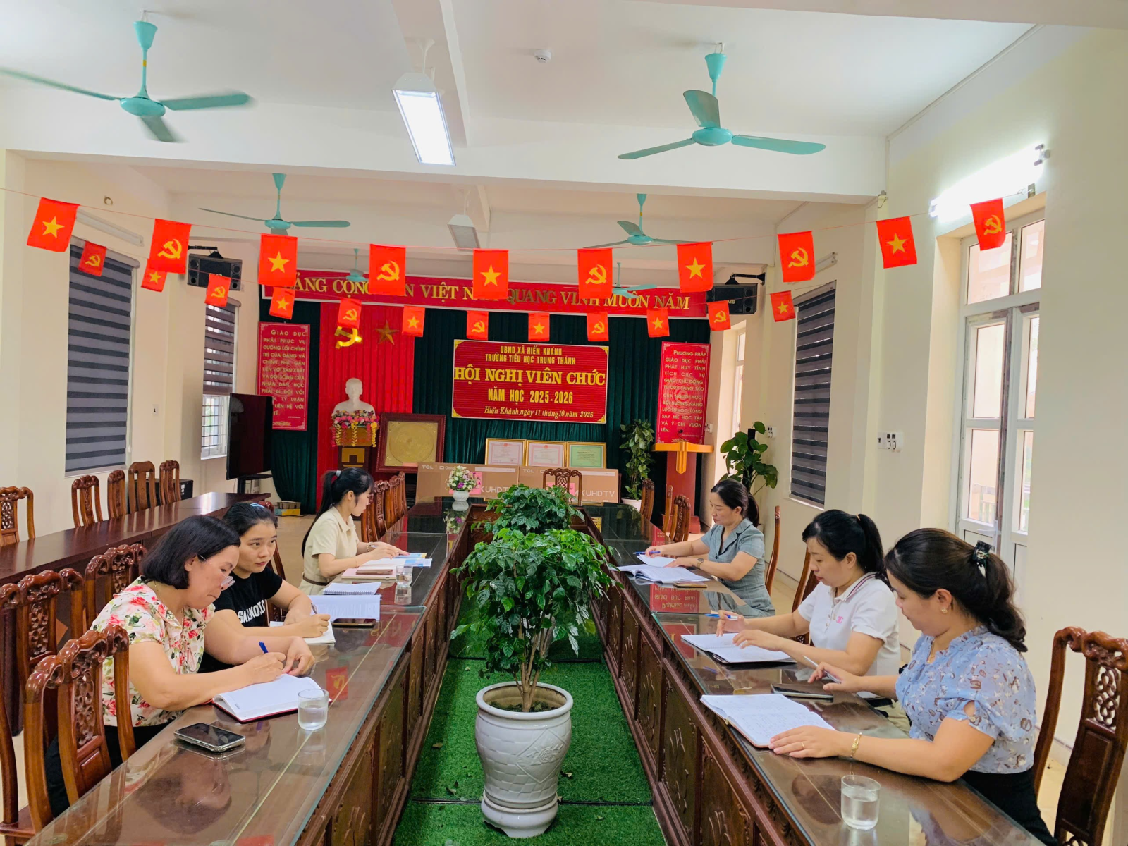BGH cùng các cô giáo trong tổ chuyên môn 4, 5 trao đổi sau tiết dạy